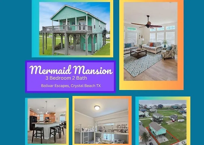 Mermaid Mansion By Bolivar Escapes ist ein luxuriöses Refugium an der malerischen Küste von Crystal Beach. Umgeben von unberührter Natur und frischem Seewind, bietet diese Unterkunft eine perfekte Kombination aus Komfort und Eleganz. Die stilvolle Architektur und die hochwertige Ausstattung sorgen dafür, dass sich jeder Gast sofort wohlfühlt.